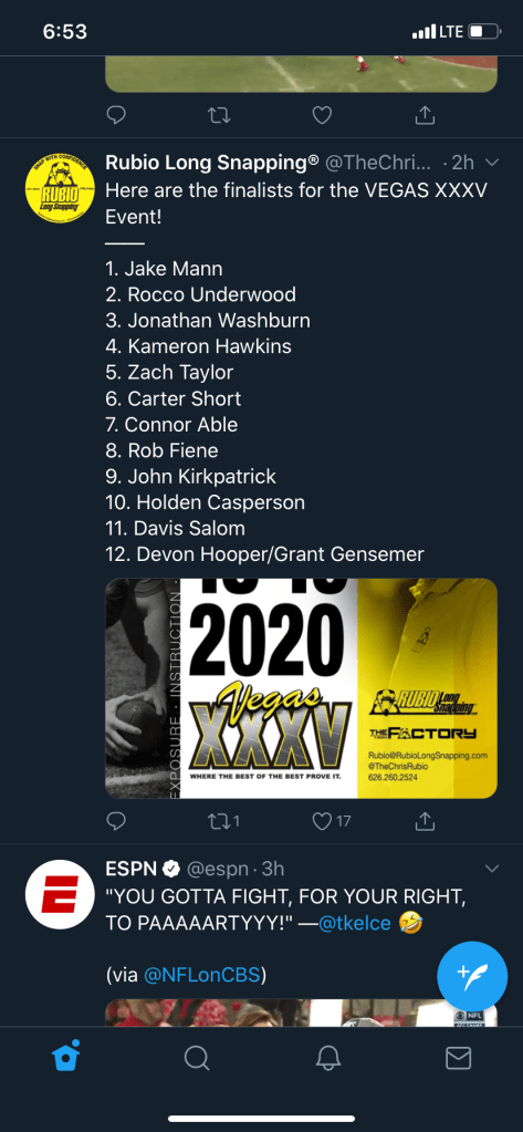 A huge thank you to Chris Rubio, the founder of Rubio Long Snapping, for not only motivating me to become a better snapper, but giving me all the tools I need to succeed at the next level. Thanks Chris!!!